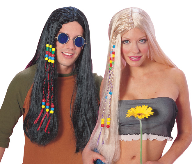 One size fits most with these great Black Hippie Wigs. Nice Quality Flower Power Wigs. Also available in blonde.