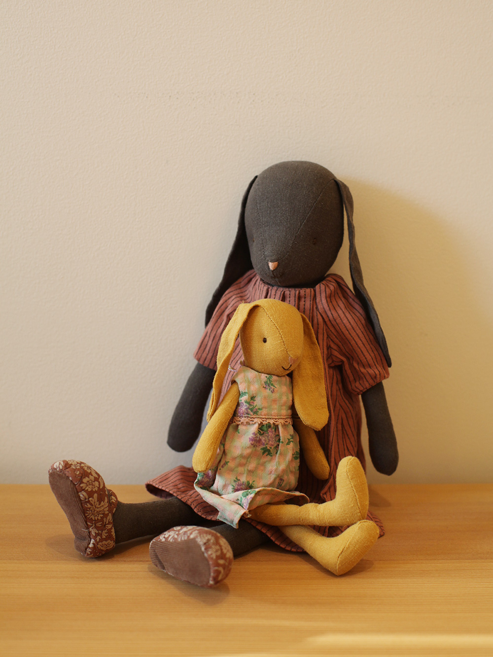 A bunny made of soft natural linen fabric that gives a lovely hand feel and look. Sizes 1 bunnies fit into the Maileg doll house and all furniture size Mini. If a new wardrobe is needed it is possible to buy loose clothes for this friend.