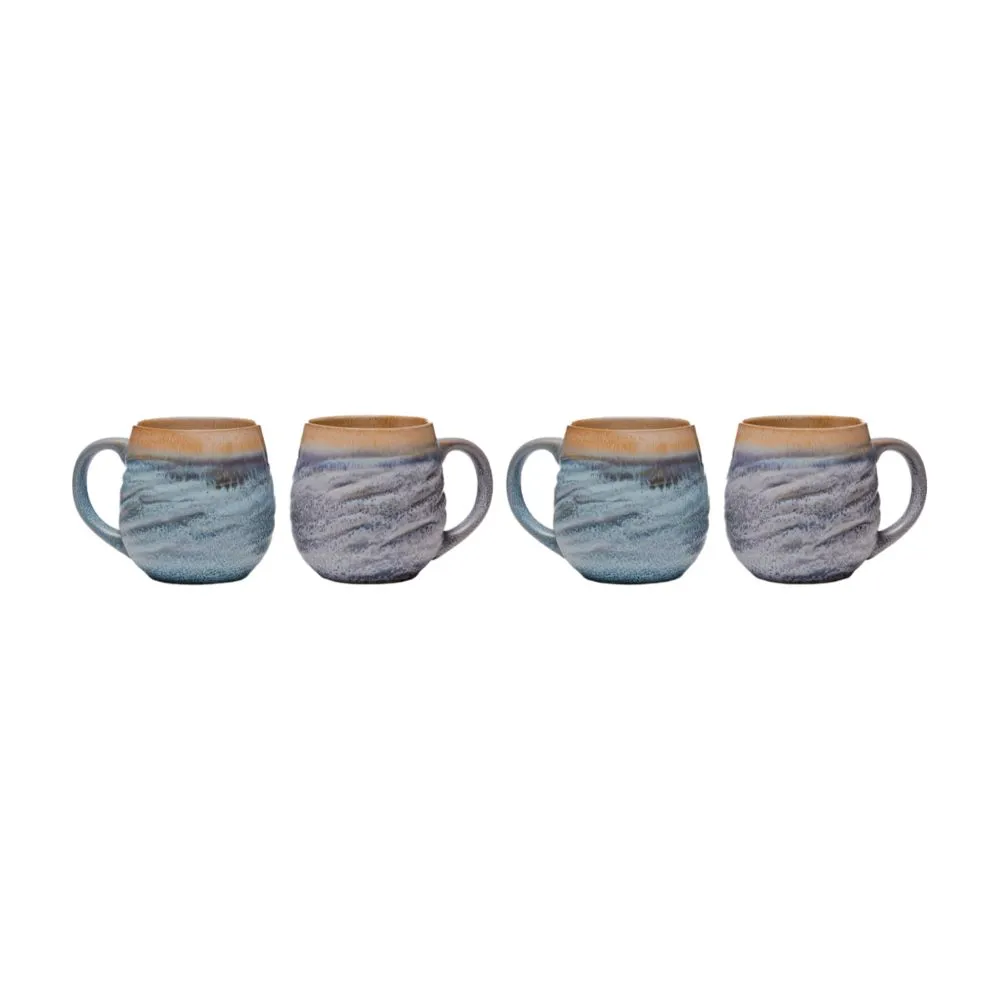 A beautiful set of 4 heavy ceramic mugs in soft shades of pale blue and grey, featuring a textured finish.