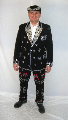 Pearly King costume consists of button adorned Jacket and trousers, and hat.