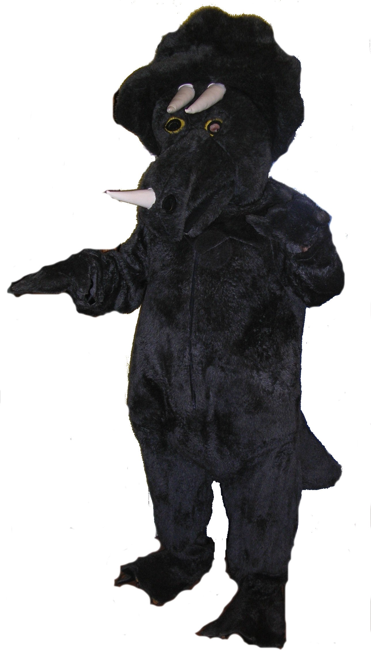 Torosaurus Dinosaur includes a large body suit, with attached hand and feet covers and over the head mask.