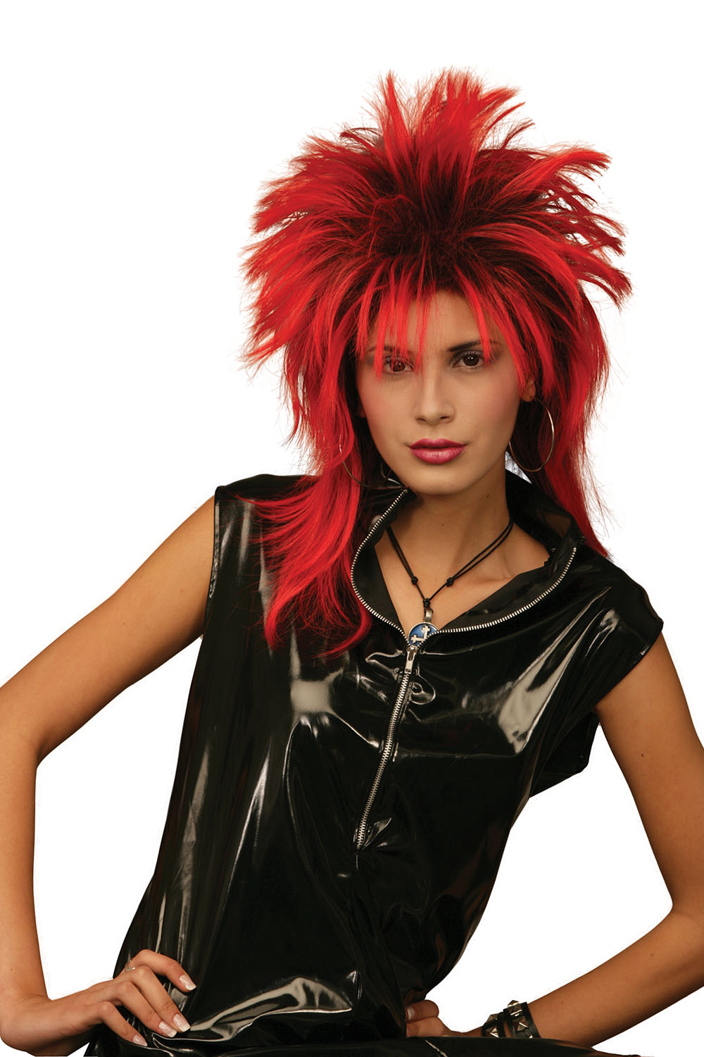 If you are looking a great looking two tone wig this red and black wig is perfect for you. This Rock wig works well as a male wig and a female wig. One size fits all. This hairstyle is inspired by Ziggy Star Dust with a great red colour and style it is ideal for any Fancy Dress costume.